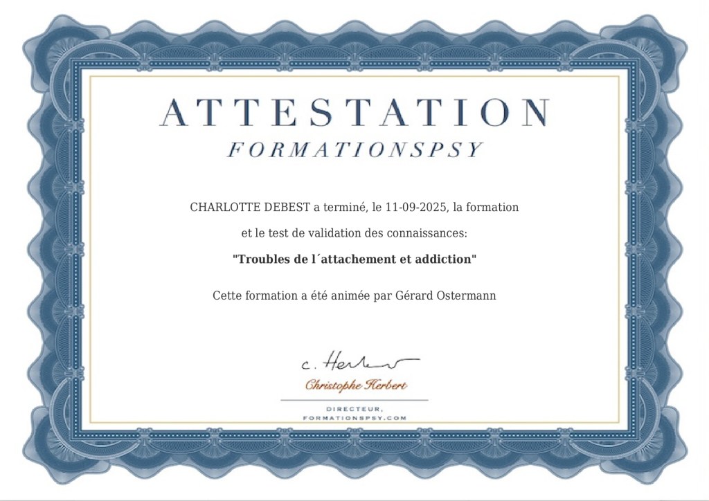 Je suis ravie d’avoir suivi cette formation animée par le docteur Gérard Ostermann sur les troubles de l’attachement et les addictions. Une très belle formation avec beaucoup d’apports théoriques et de nombreux cas pratiques.