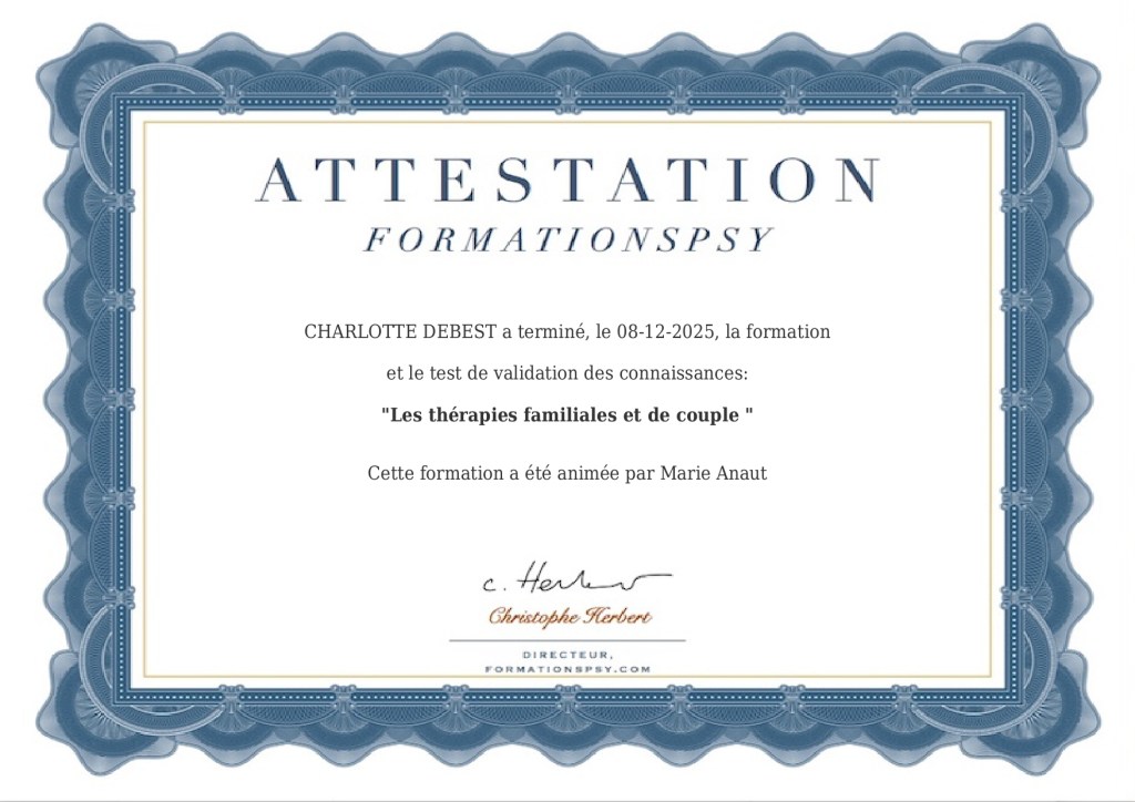 Je suis très heureuse d’avoir suivi cette formation animée par Marie Anaut autour des thérapies familiales et de couples.